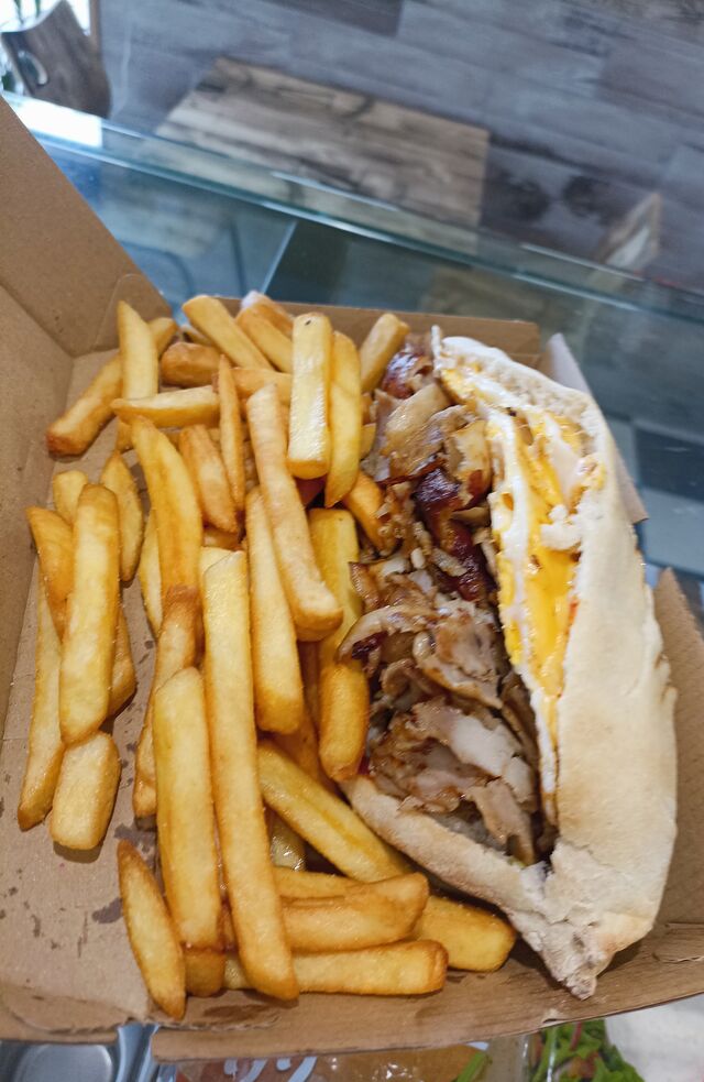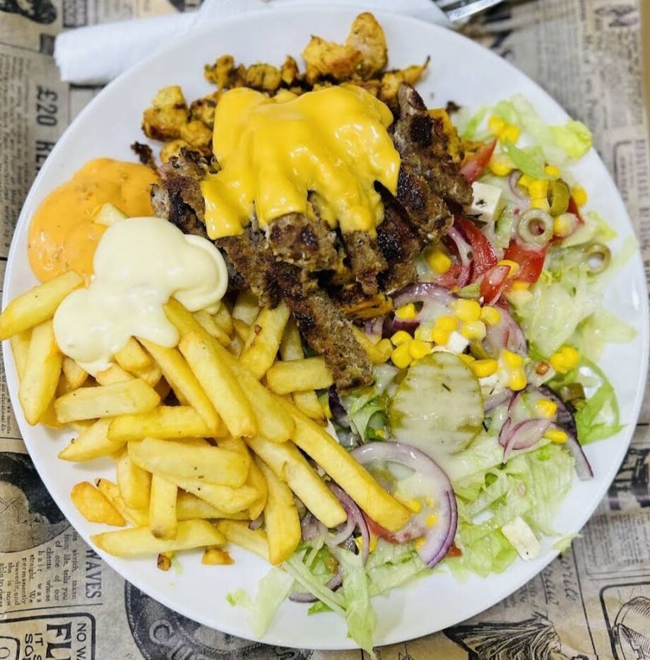 Frites, feta, salades avec une viande au choix ou deux ou trois ...